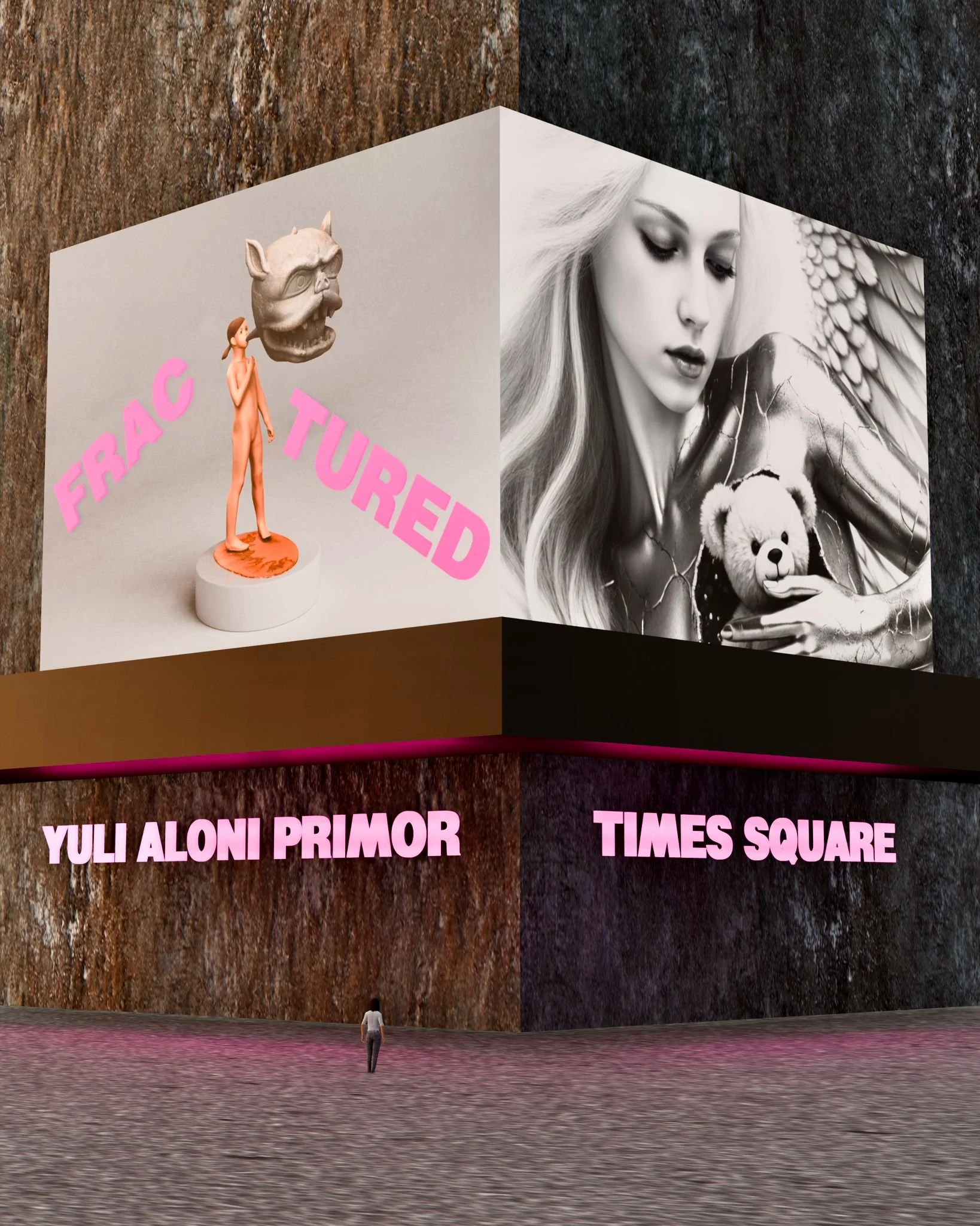 In Fractured, Yuli Aloni Primor situates an art of rupture at the symbolic center of the contemporary city. Installed in the gallery and projected on the ZAZ Corner digital billboard in Times Square for a limited time, the exhibition places an intimate visual language inside the accelerated rhythm of public urban space. The two contexts do not illustrate each other but exist in productive friction: the private made monumental, the monumental made vulnerable.