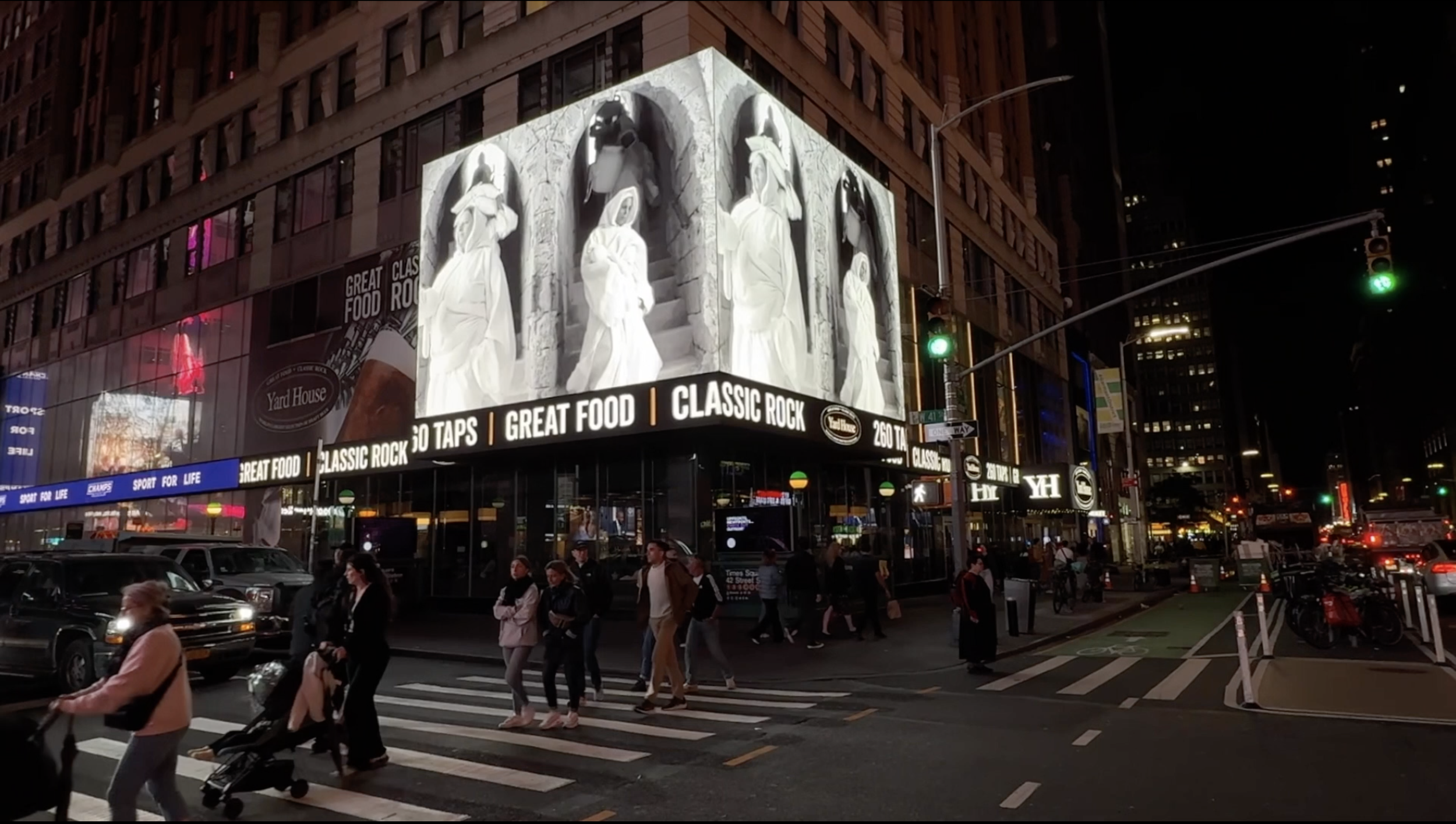 The presentation includes two 15-second video excerpts adapted from the original work Beyond the Walls, bringing Adon’s evocative imagery into the public space of New York City.