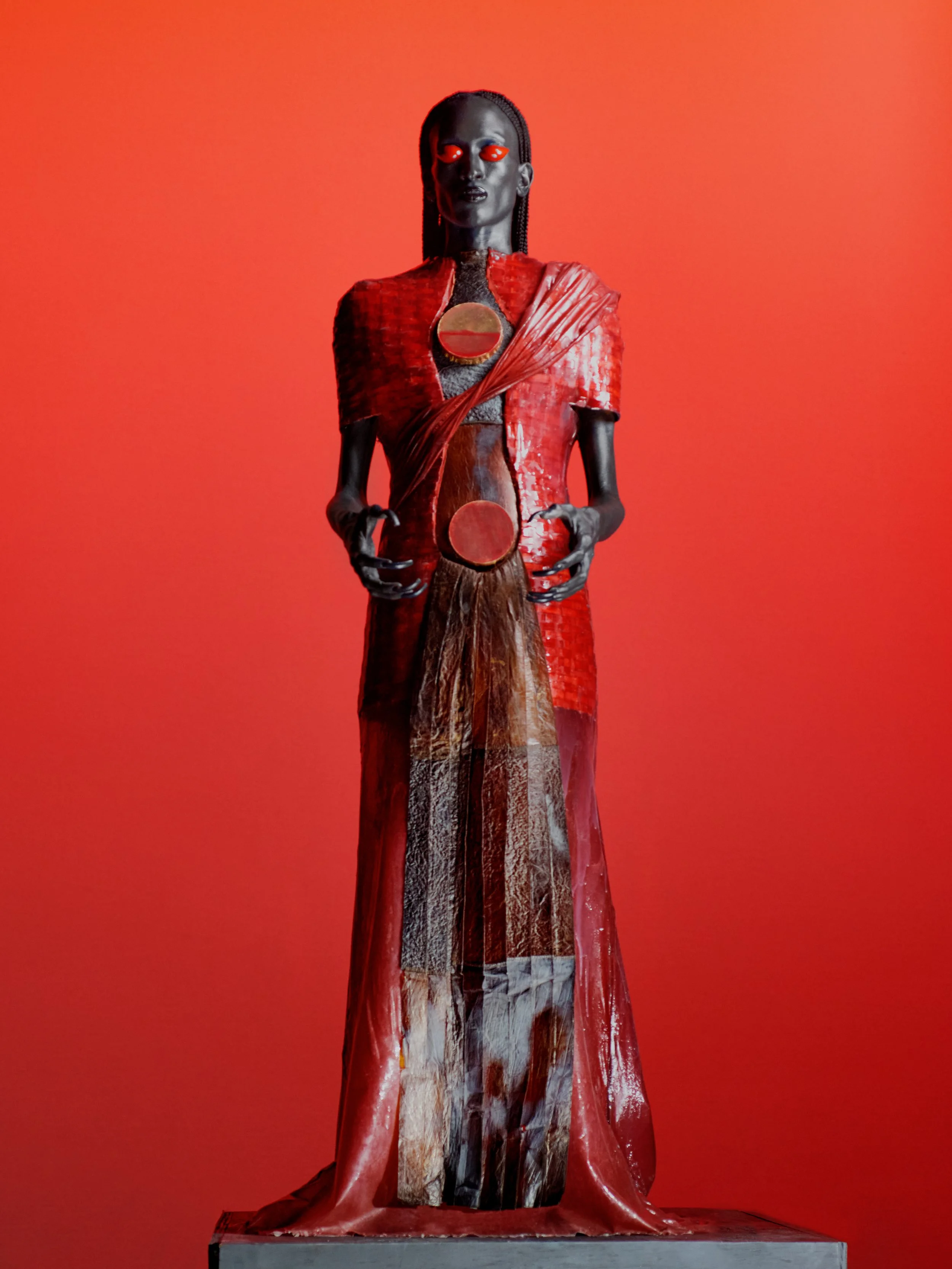 The red drop obtained from the mother, which has remained at the level of the navel, begins to rise towards the heart. One experiences the radiant red sky. A clear sky pervaded by the redness of the sun. “For me, it was all about texture. The red sky is revealed as an interlocked cage - like form. My body splits open to reveal a leathery rotting inside. The internal sound of the drum beats on. The red sky feels wet The hands are open but clamped in a grasp.”
